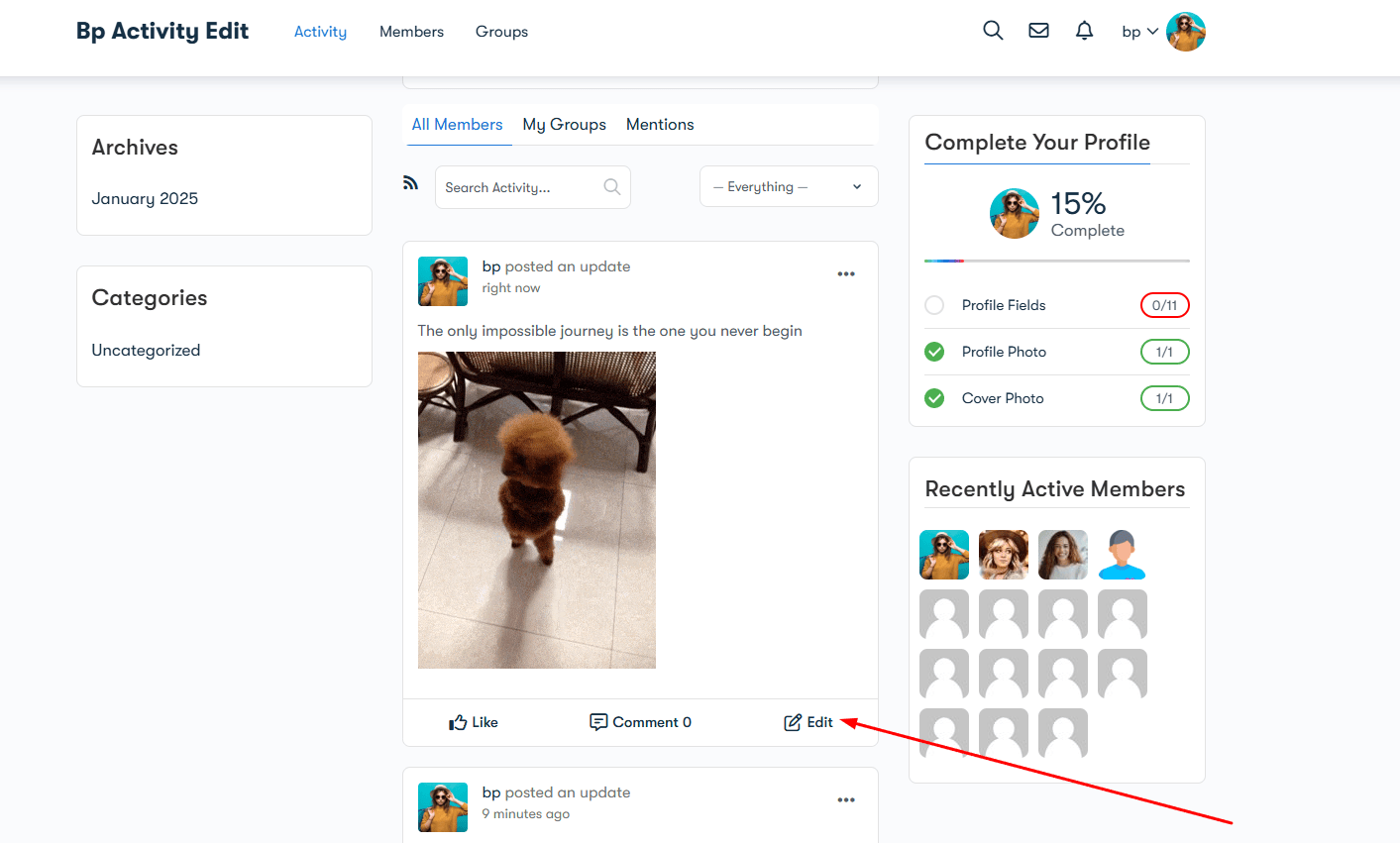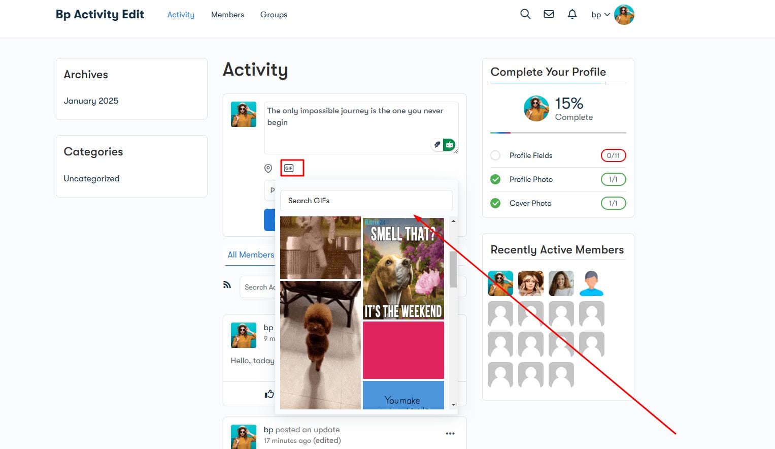 With the BuddyPress Edit Activity plugin integrated, users have the ability to edit their posts that include GIFs after they have been published. If a user needs to change their GIF or update their accompanying text, they can easily do so by clicking the Edit button next to their post.