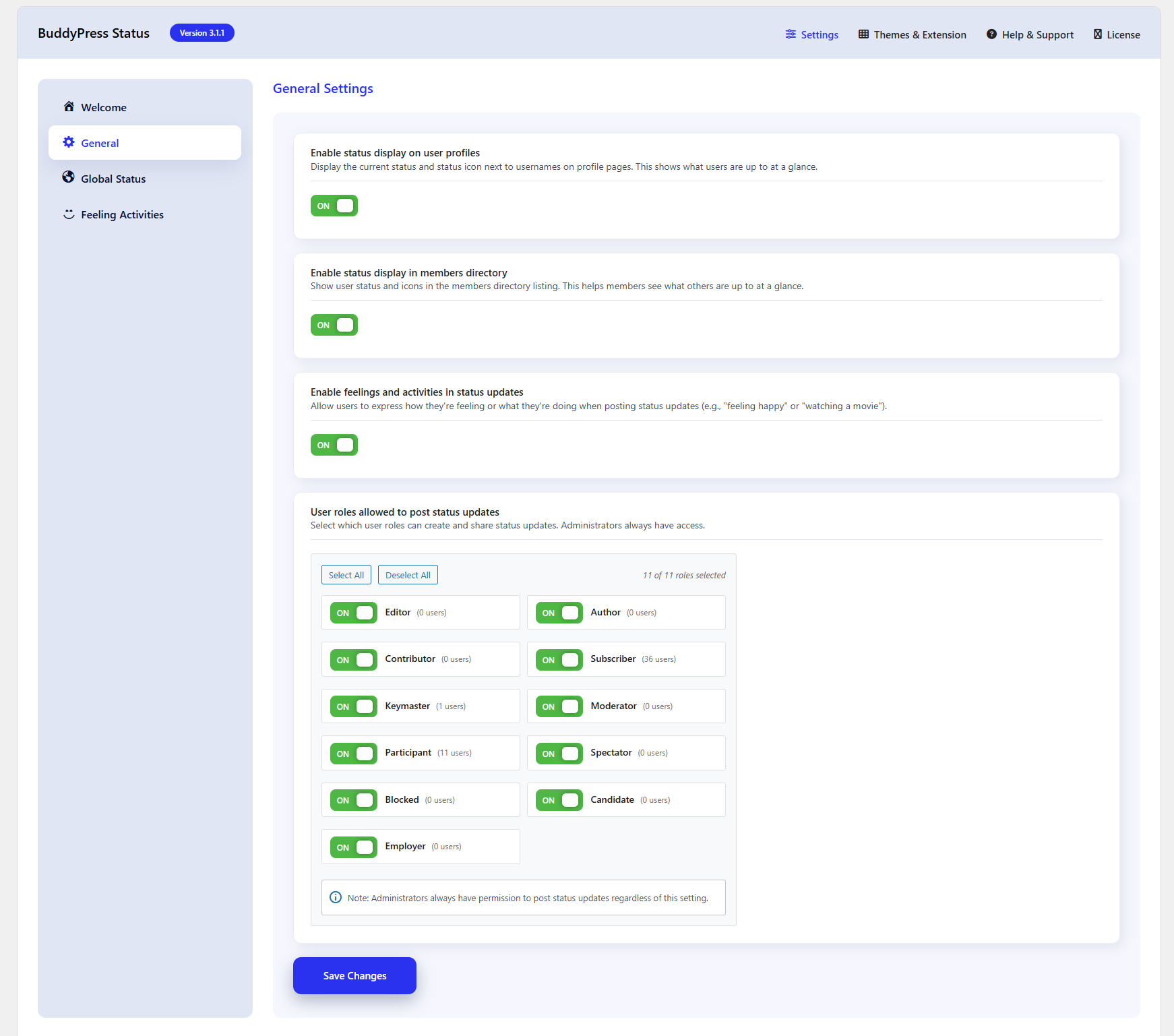 Q: How do I hide status updates from certain user roles?ย A: Go to General Settings and uncheck the user roles you want to restrict access for.