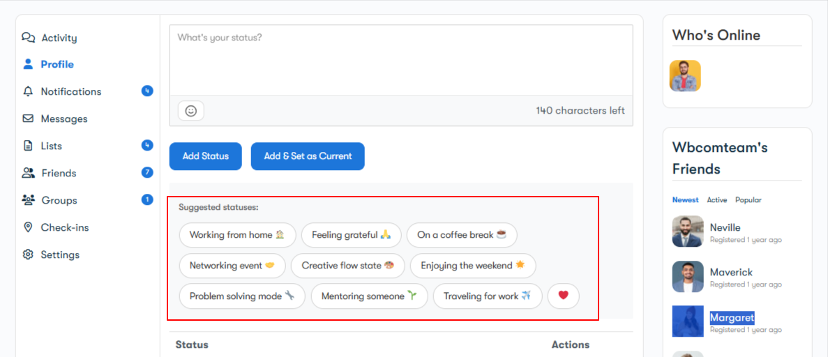 - Look for “BuddyPress Status” in your admin menu under “WB Plugins”