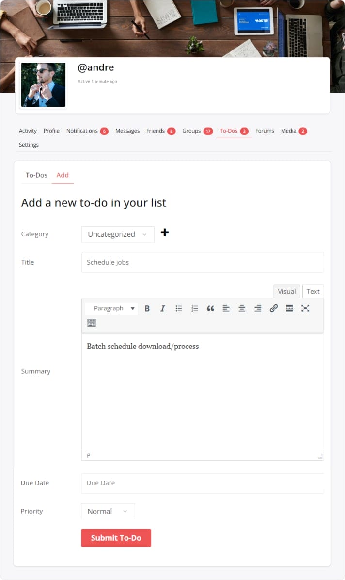 - Fill up the information such as Title, Summary, and Due Date. Select a category and priority and click on Submit To-Do.