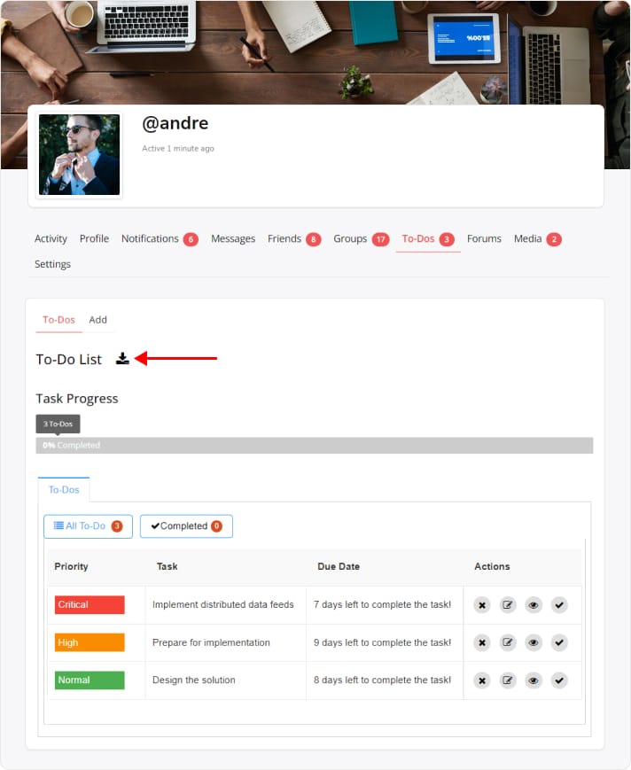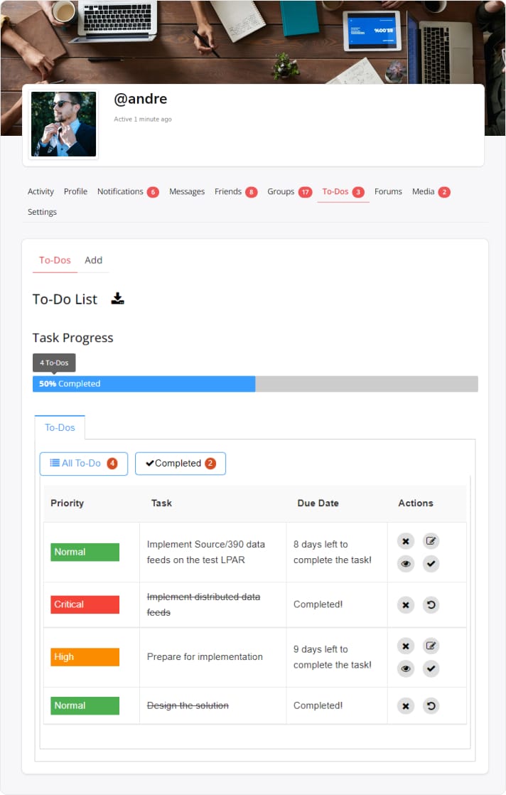 User To-Do list enables the users to add their tasks to their profile. At the moment, BuddyPress Todo List allows you to create your task list. You can mark them complete when you are done with them. It will also send a reminder when you have any remaining tasks.