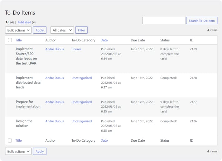 - Also, all the to-do lists can be administered from the Admin Dashboard. Navigate to wp-admin > To-Do Items.