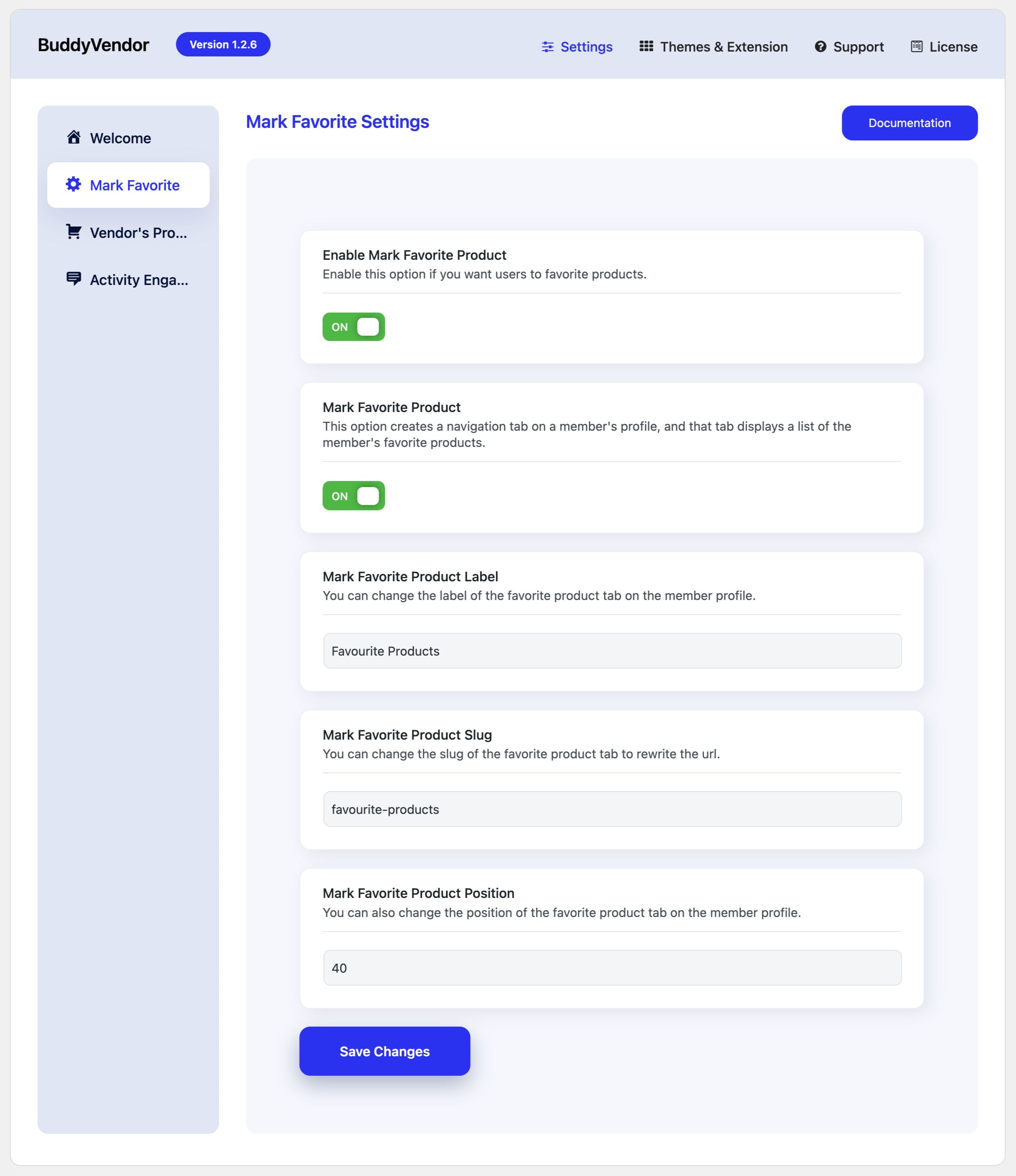 Navigate to WB Plugins >> BuddyVendor >> Mark Favorite, and enable the favorite product feature. These favorite products can also be displayed on the user’s BuddyPress profile If enabled.