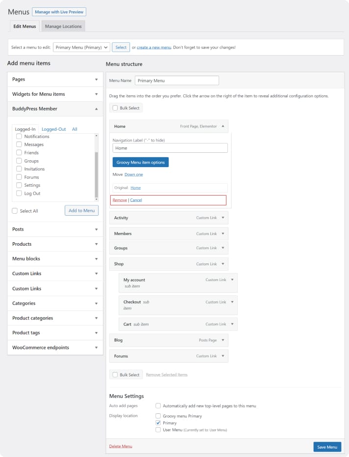 Note: The Screen Options allow you to choose which items you can use to add to a menu. Certain items, like Tags, and BuddyPress options, are hidden by default.