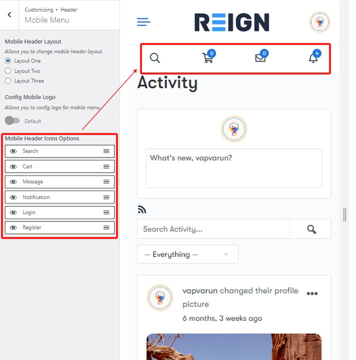 Dashboard >> Appearance >> Customize >> Header >> Layout >> Manage Icons Options.